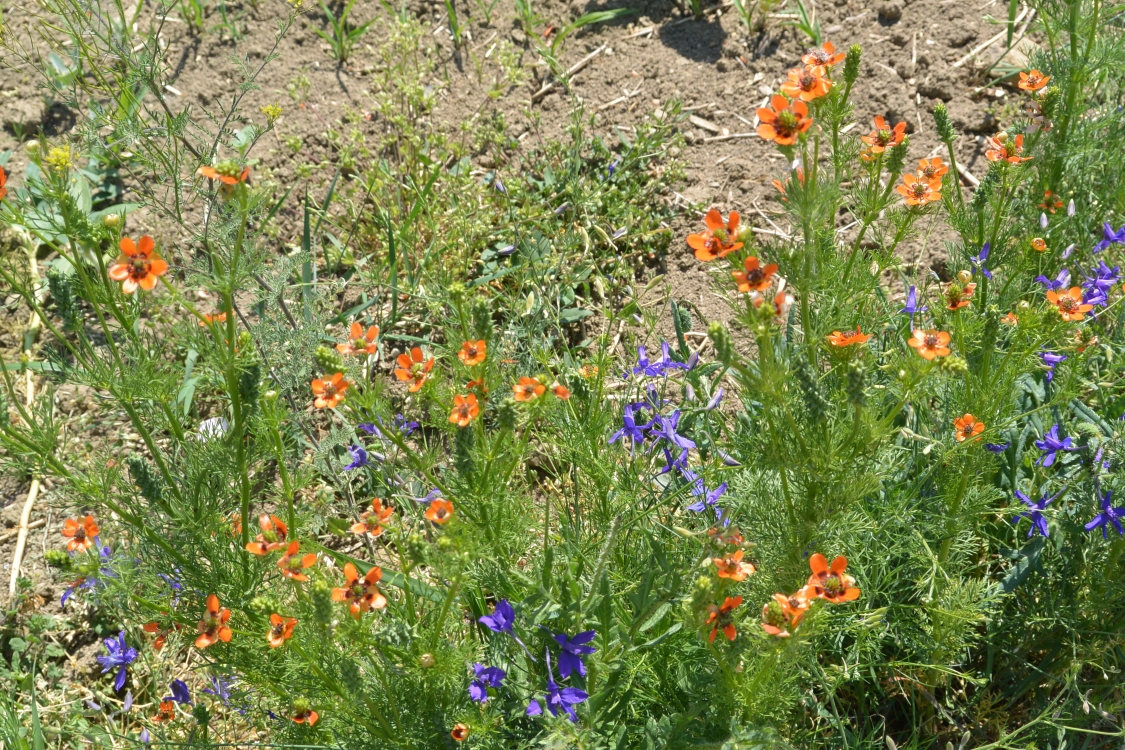 Das Sommeradonisröschen und der Feldrittersporn sind zwei schon selten gewordene Ackerwildkräuter, die hier im nördlichen Weinviertel am Rand eines Feldes wachsen.