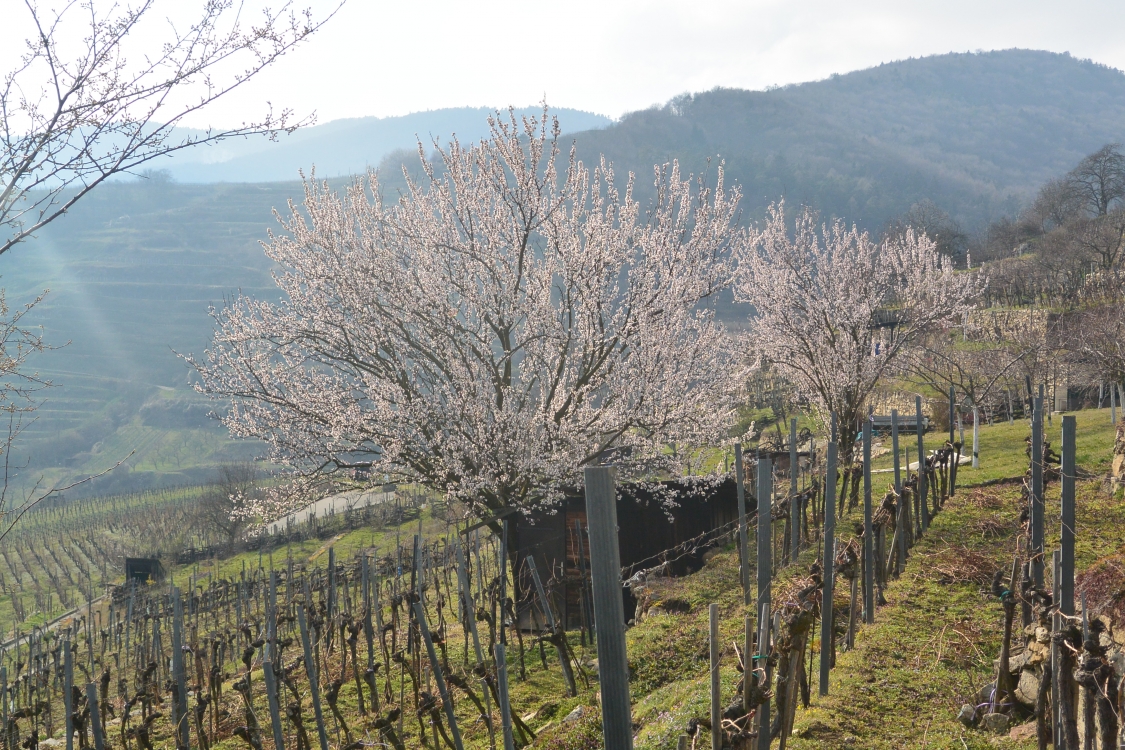 Mandelbäume sind die am frühesten blühenden Obstgehölze und in der Wachau schon lange in Kultur. Hier in Weißenkirchen wachsen sie zwischen den terrassierten Weingärten.